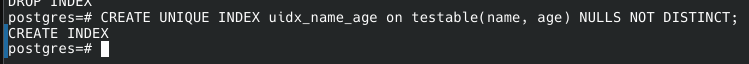 CREATE UNIQUE INDEX uidx_name_age on testable(name, age) NULLS NOT DISTINCT;