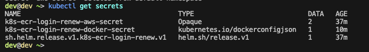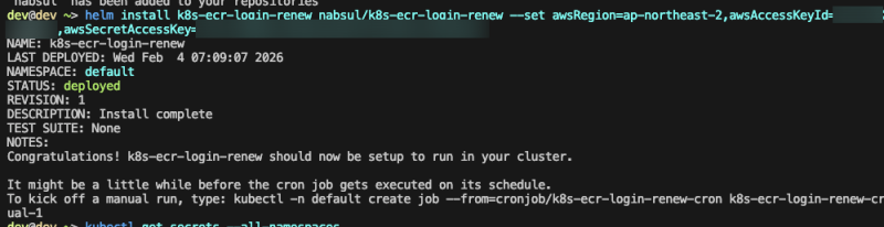 helm install k8s-ecr-login-renew nabsul/k8s-ecr-login-renew --set awsRegion=๋ฆฌ์ ,awsAccessKeyId=์ก์ธ์คํค,awsSecretAccessKey=์ํฌ๋ฆฟํค