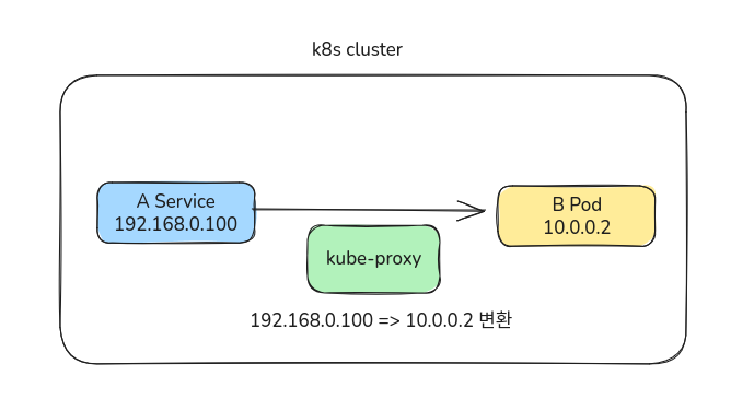 ์๋ฅผ ๋ค์ด ์ ๊ทธ๋ฆผ์ฒ๋ผ A ์๋น์ค๊ฐ 192.168.0.100๋ก ๊ฐ๋ฐฉ๋์ด์๊ณ , A Service์๋ B๋ผ๋ Pod๊ฐ 10.0.0.2 IP๋ก ๋ถ์ด์๋ ์ํ์์ 192.168.0.100๋ก ์์ฒญ์ด ๋ค์ด์จ๋ค๋ฉด, kube-proxy๋ ๊ทธ๊ฑธ ๊ฐ๋ก์ฑ์ 10.0.0.2 pod๋ก ๋๊ธด๋ค.