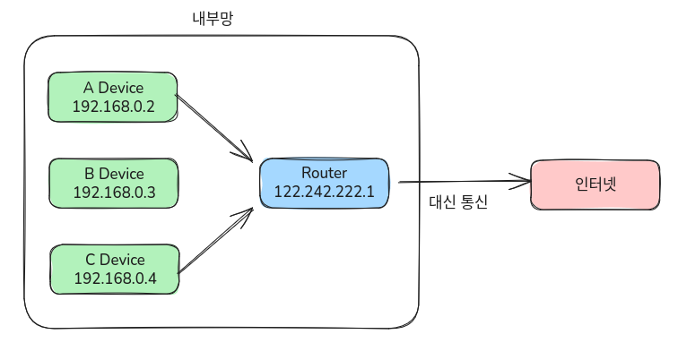 ํ์ง๋ง ๊ฐ๋ณ ์ฅ์น๋ค์ ๊ณต์ ๊ธฐ๊ฐ ํ ๋นํ ๋ด๋ถ IP๋ฅผ ๊ฐ๊ณ ์์๋ฟ, Public IP๋ฅผ ๊ฐ๊ณ ์์ง ๋ชปํ๋ค. ๊ณต์ ๊ธฐ๊ฐ ํ๋์ Public IP๋ฅผ ๊ฐ๊ณ ์์ ๋ฟ์ด๋ค.