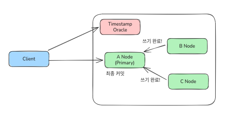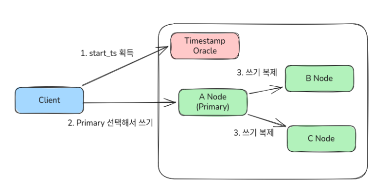 클라이언트는 쓰기를 먼저 받을 Primary 노드를 고르고, 거기에 start_ts와 함께 트랜잭션을 날린다.