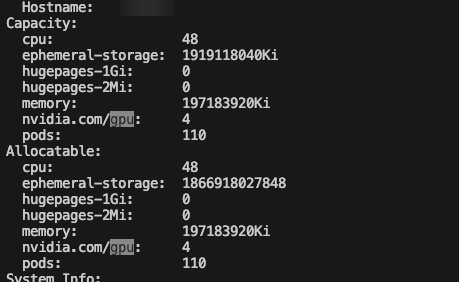 다음 명령을 사용하면 각 노드가 gpu를 몇개씩 가지고 있는지 확인 가능하다.