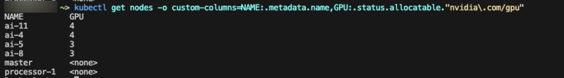 kubectl get nodes -o custom-columns=NAME:.metadata.name,GPU:.status.allocatable."nvidia\.com/gpu"