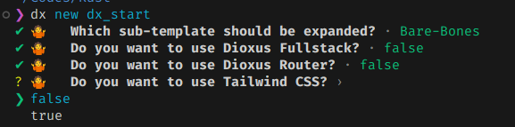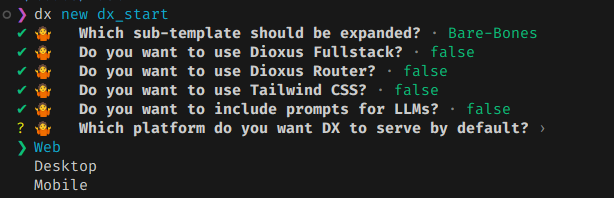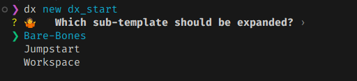 dx new 명령을 사용하면 대화형 터미널을 통해 프로젝트 생성 컨텍스트가 시작된다.