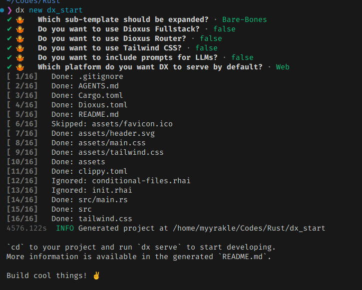 dx new 명령을 사용하면 대화형 터미널을 통해 프로젝트 생성 컨텍스트가 시작된다.