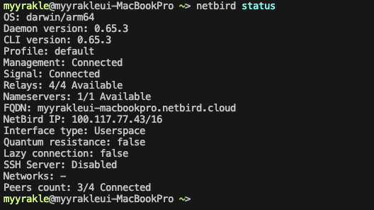 netbird ๋ฑ๋ก์ด ์ ๋๋ค๋ฉด, status ๋ช ๋ น์ ํตํด ํผ์ด์ ์ฐ๊ฒฐ ์ํ๋ฅผ ํ์ธํด๋ณผ ์ ์๋ค.