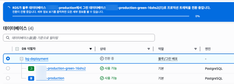 문제가 없다는 것이 판단되면, 전환 기능을 사용해서 새로운 DB로 교체를 시작할 수 있다.
