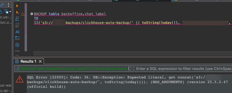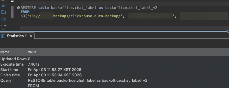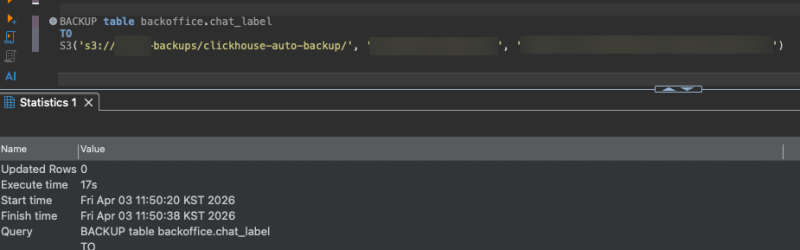 S3('s3://버킷명/clickhouse-auto-backup/${today}', '${process.env.AWS_ACCESS_KEY_}', '${process.env.AWS_ACCESS_KEY_SECRET}')